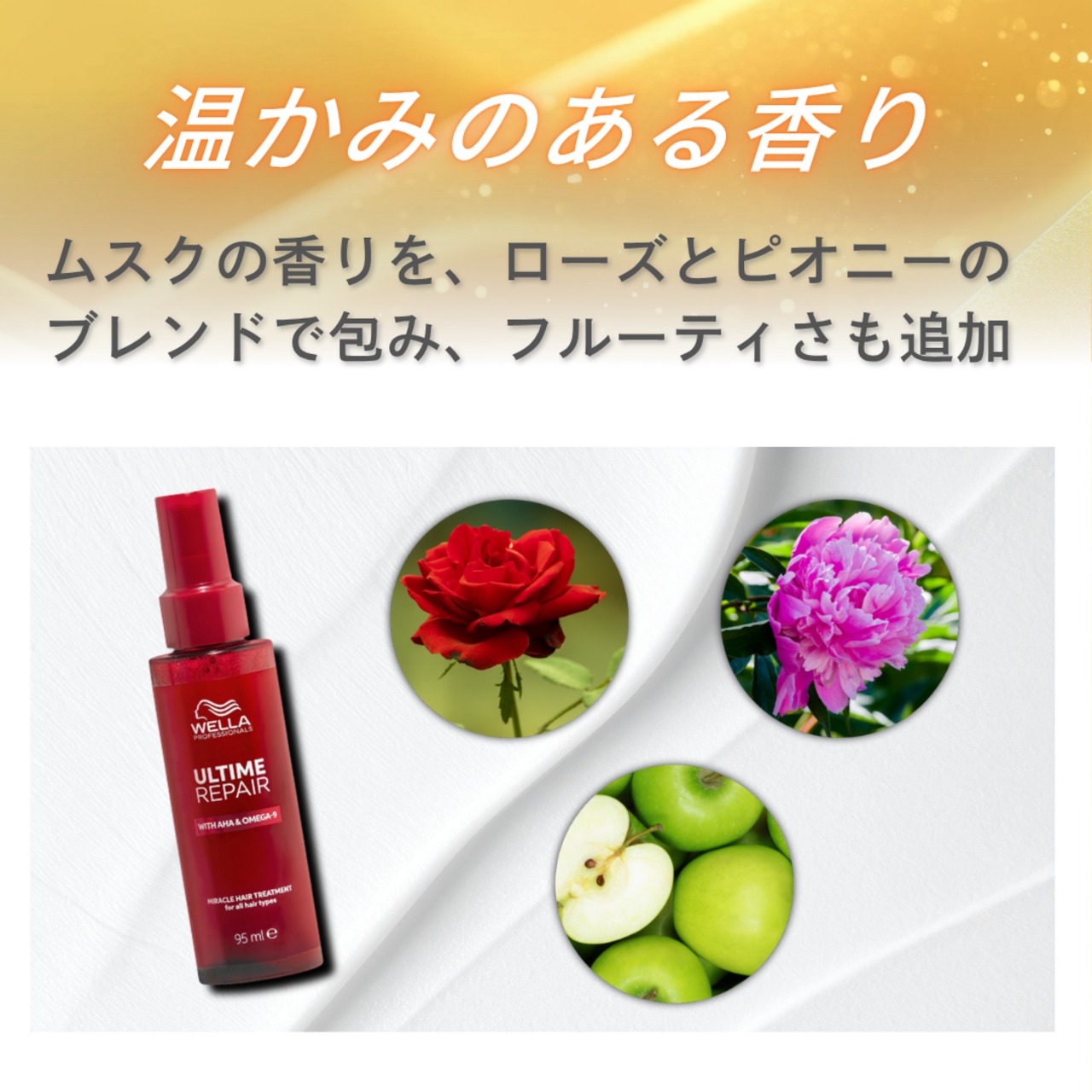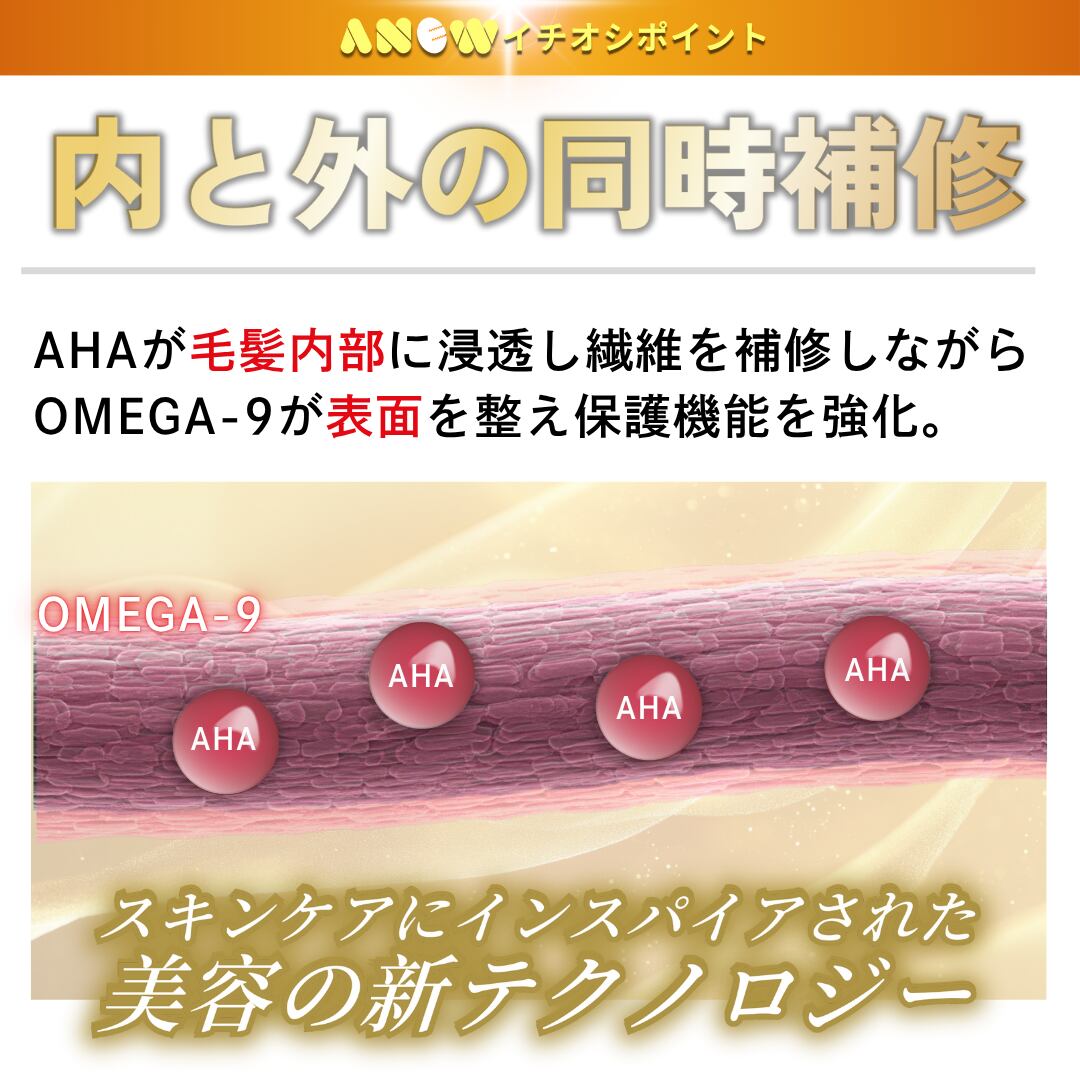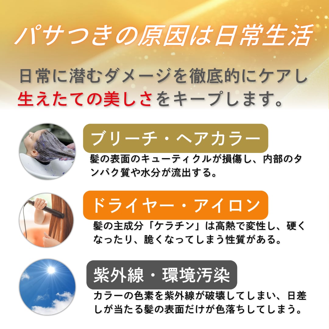 乾燥やパサつき、広がりを感じる髪にすっとなじみ、なめらかで扱いやすい質感へ導きます。
